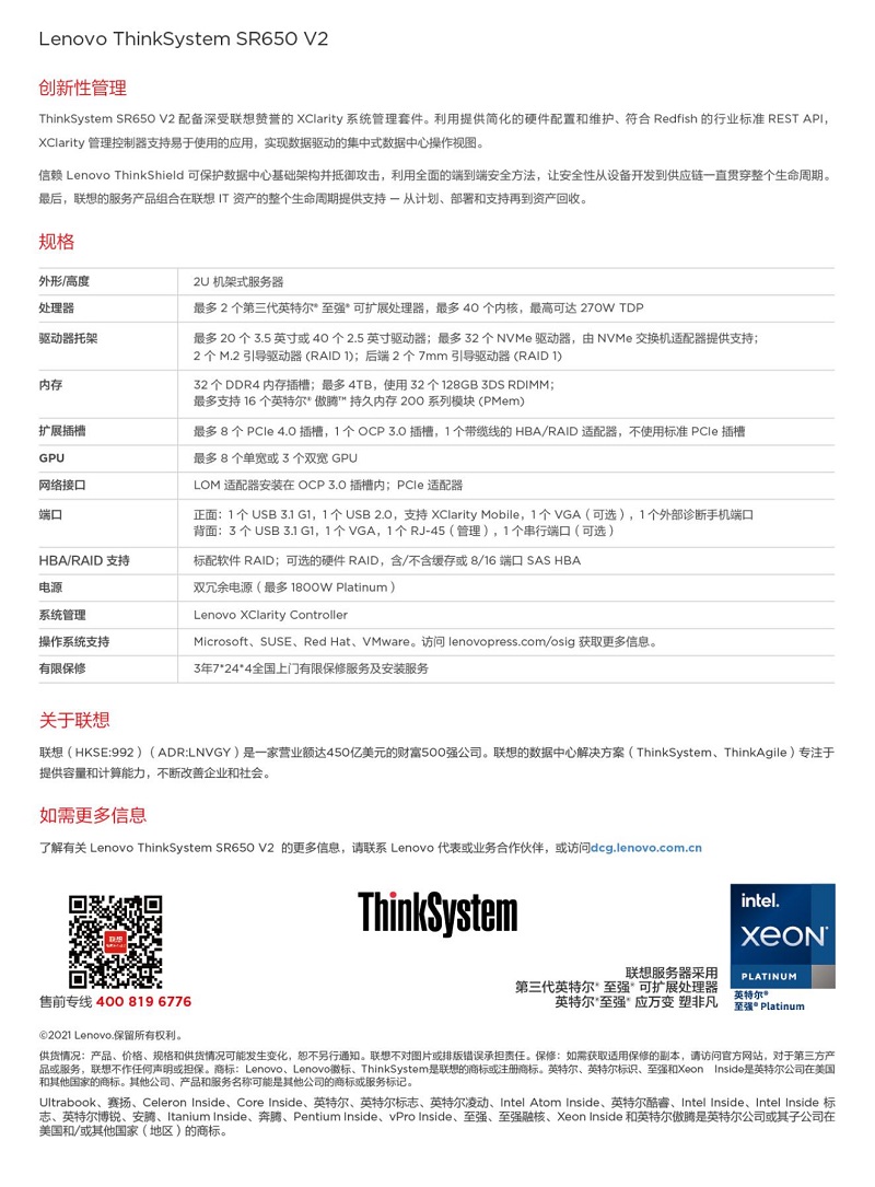 Lenovo ThinkSystem SR650V2服務器